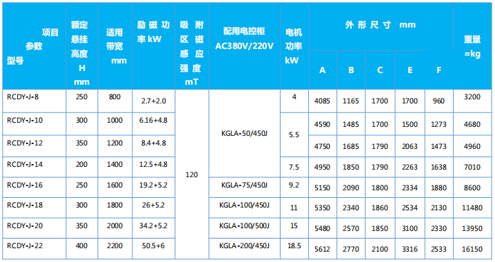 四、RCDY-J系列懸掛式組合回收型除鐵器主要技術參數、外形尺寸 執行標準:JB/T7689、JB/T10885