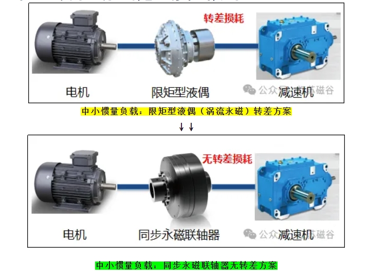 風(fēng)機(jī)水泵平方轉(zhuǎn)矩類用液力偶合器或渦流永磁調(diào)速器調(diào)速,電機(jī)功率1000kW,調(diào)速比i=80%,轉(zhuǎn)差損耗功率= (80%^2 - 80%^3)*1000 = 63.5kW;按年工作8000小時(shí),電費(fèi)0.6元/度計(jì)算,年耗電費(fèi)=63.5*8000*0.6=304800(元) 據(jù)估算,(1) 用于緩沖沖擊保護(hù)配套有阻尼類緩沖液力偶合器每年轉(zhuǎn)差損耗為478億千瓦時(shí);(2) 用于風(fēng)機(jī)、水泵負(fù)載轉(zhuǎn)差調(diào)速過(guò)程每年產(chǎn)生的轉(zhuǎn)差損耗為560億千瓦時(shí);合計(jì)轉(zhuǎn)差損耗478+560=1038億千瓦時(shí),占比2022年中國(guó)工業(yè)領(lǐng)域電機(jī)總用電量3.98萬(wàn)億千瓦時(shí)2.68%。相當(dāng)三峽發(fā)電全年的發(fā)電總量。 【解決緩沖轉(zhuǎn)差損耗策略1】 中小轉(zhuǎn)動(dòng)慣量負(fù)載優(yōu)先采用無(wú)轉(zhuǎn)差彈性緩沖方式啟動(dòng)和運(yùn)行。