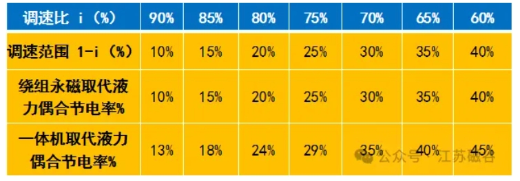 【繞組永磁調(diào)速高節(jié)電性能】 繞組永磁調(diào)速的原理就是將發(fā)熱轉(zhuǎn)差功率用永磁轉(zhuǎn)差發(fā)電技術(shù)來(lái)回收轉(zhuǎn)差能量。繞組永磁調(diào)速具有高節(jié)電性能:永磁一體就是將永磁電機(jī)和繞組永磁調(diào)速器嵌套集成的雙永磁調(diào)速電機(jī)。 1)繞組永磁調(diào)速同工況取代液力偶合調(diào)速器節(jié)電率見下表:
